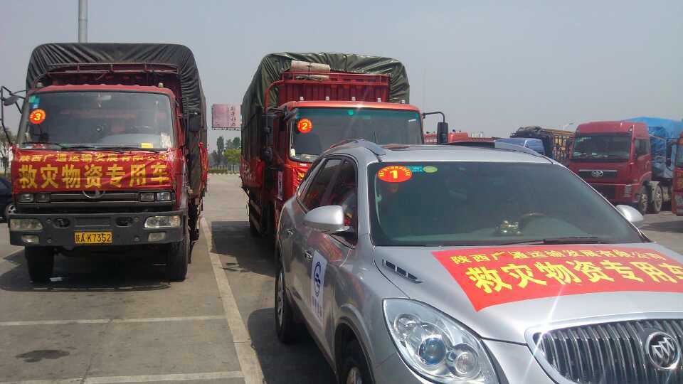陜西廣通運(yùn)輸發(fā)展有限公司救援物資車隊(duì)于4月25日凌晨三點(diǎn)左右,抵達(dá)雅安市雨城區(qū)多營鎮(zhèn)的物資集中配送點(diǎn)。本次救援物資運(yùn)送車隊(duì)由五輛大卡組成,共運(yùn)送了價(jià)值十多萬元的救災(zāi)急需物資四十余噸;行程八百五十公里;用時(shí)十八小時(shí)。到達(dá)雅安物資集中配送點(diǎn)后,當(dāng)?shù)毓ど滩块T對(duì)這批物資進(jìn)行了檢驗(yàn)、登記。經(jīng)過四小時(shí)的緊急卸載,車隊(duì)于中午十二點(diǎn)離開雅安。